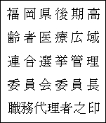 福岡県後期高齢者医療広域連合選挙管理委員会委員長職務代理者之印 | 3 | 21ミリメートル | てん書 | 選挙管理委員会委員長職務代理者名をもってする公文書用 | 書記長 | 1 |